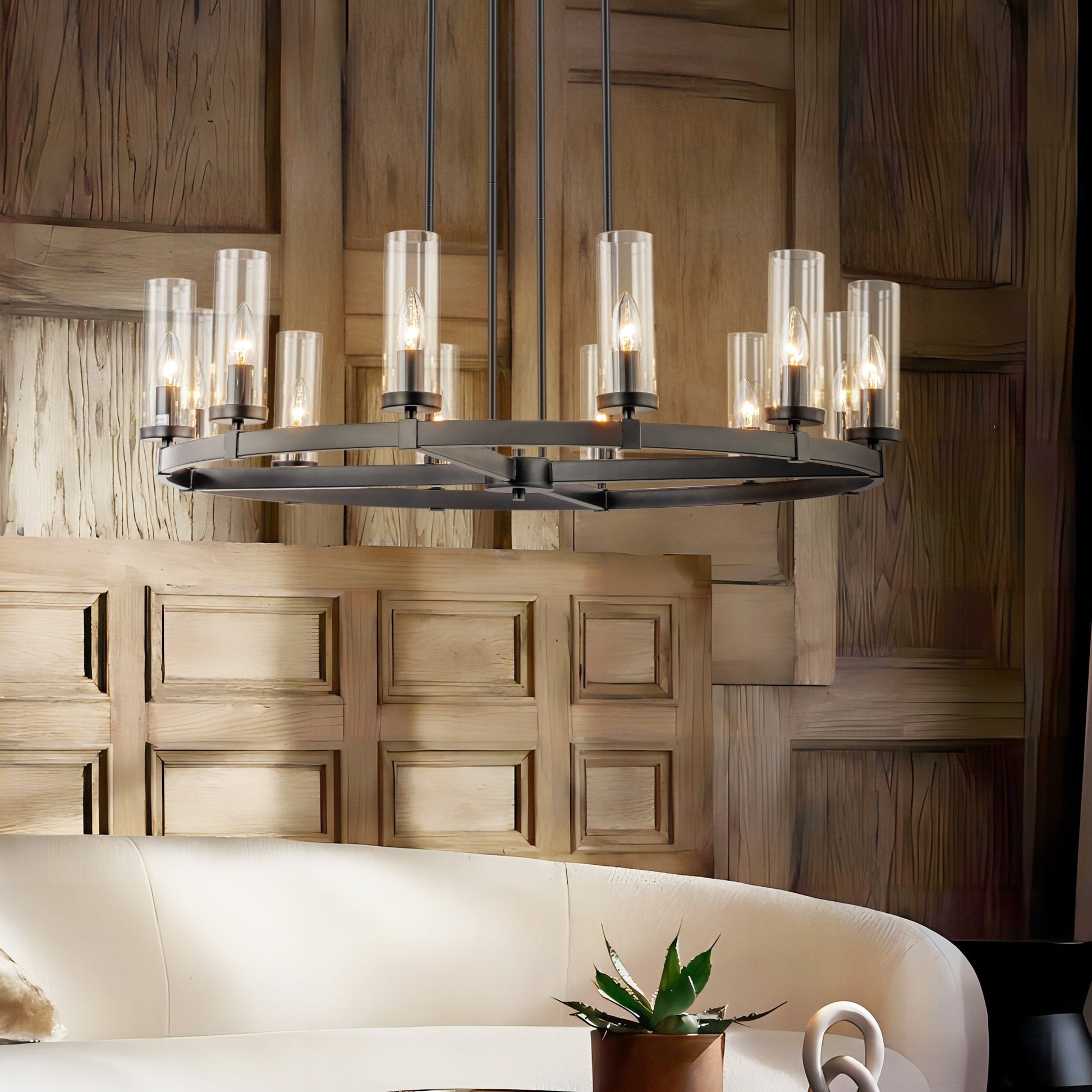 Questo lampadario a 12 luci in vetro trasparente a forma di ruota di carro in stile retrò industriale, con un diametro di 89 cm, è un esempio di maestria artigianale e ingegnosità progettuale senza pari. La luce attraversa il paralume in vetro trasparente e diffonde un'illuminazione morbida e intensa, proiettando un'aura luminosa che avvolge con grazia il vostro spazio abitativo. Allo stesso tempo, questo opulento apparecchio presenta una caratteristica struttura a forma di ruota e un elegante design a forma di candelabro cilindrico (non incluso), emanando una presenza imponente con una spiccata estetica industriale vintage.