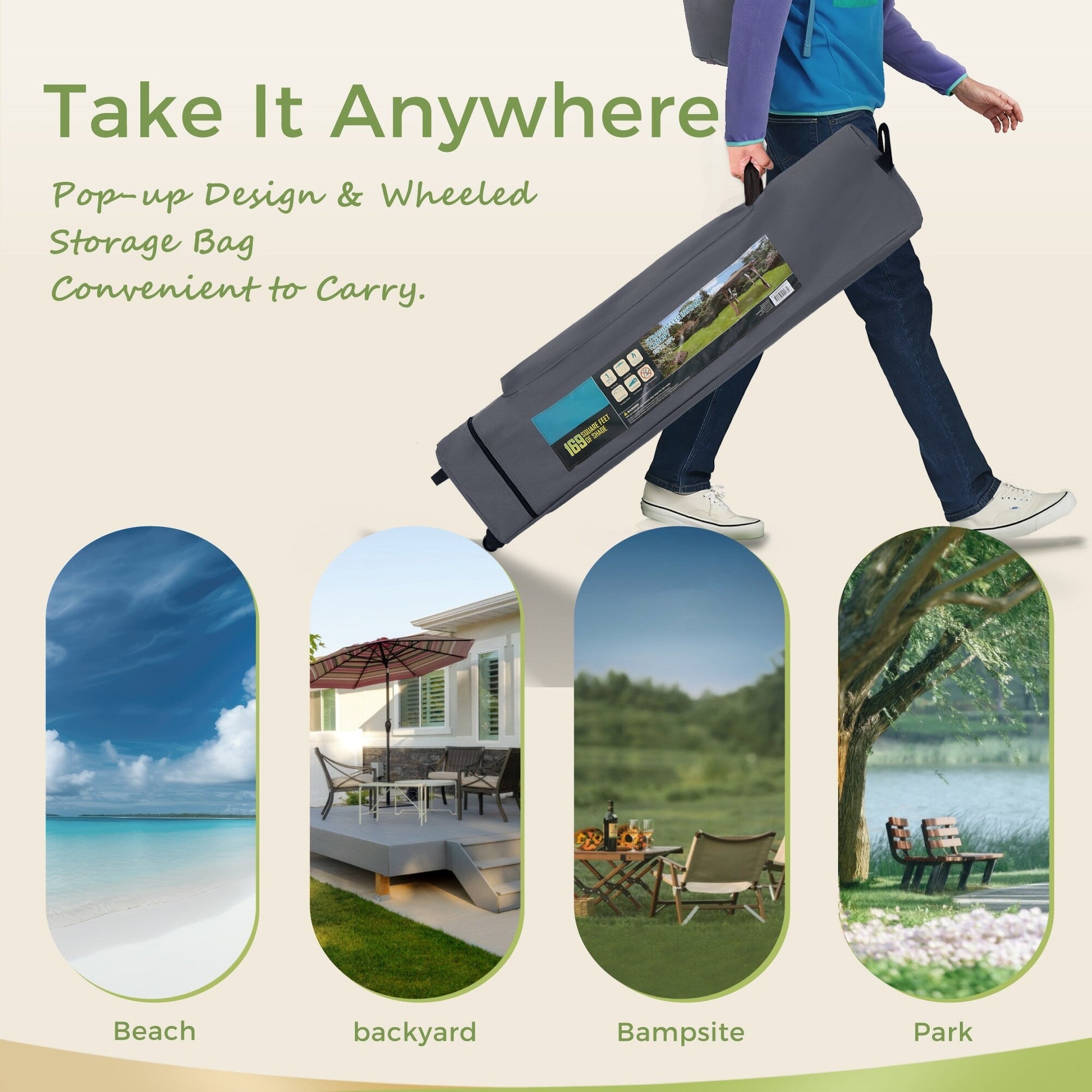 La tenda a scomparsa è realizzata in acciaio e ferro. Il telaio è antiruggine e verniciato a polvere, il che rende la tenda a scomparsa durevole, robusta e sicura. Usala dove vuoi. Dai picnic, alle feste, alle gite in campeggio e alle attività al parco, ai mercati agricoli, alle piccole imprese e così via, questa tenda è perfetta per ogni occasione.