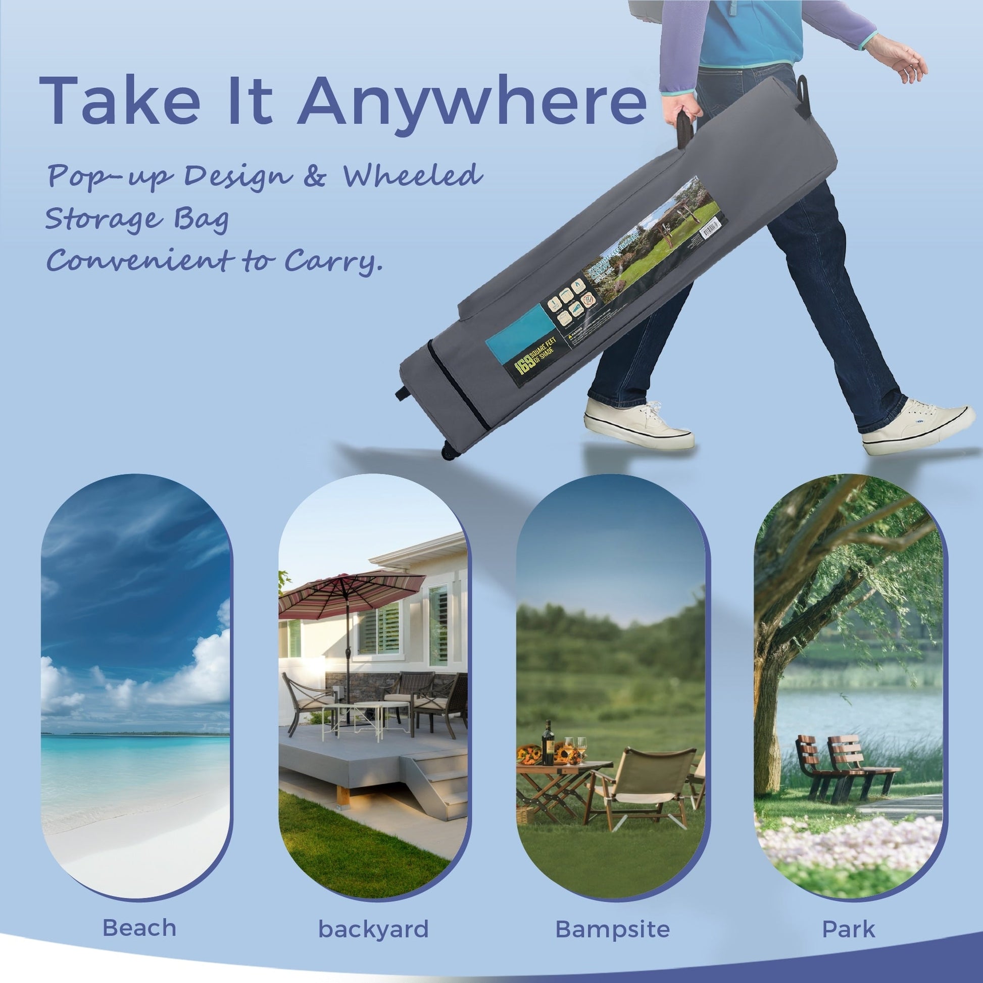 【Accessori】 : Borsa con ruote inclusa per un facile trasporto e stoccaggio. Ricordarsi di stabilizzare la tenda con tiranti e picchetti inclusi.