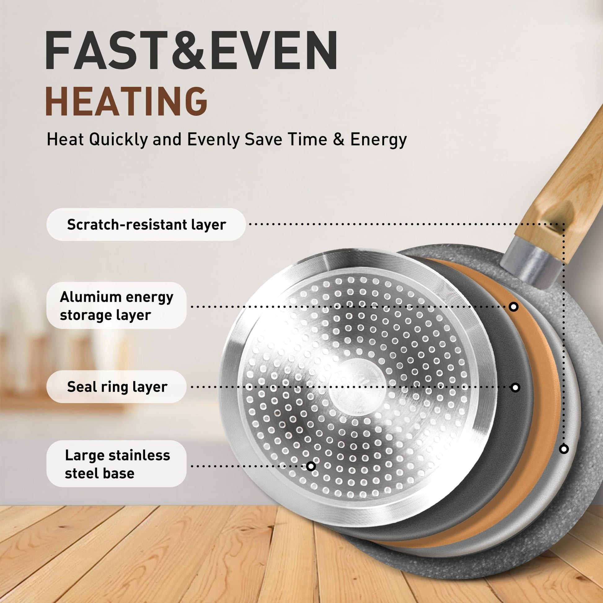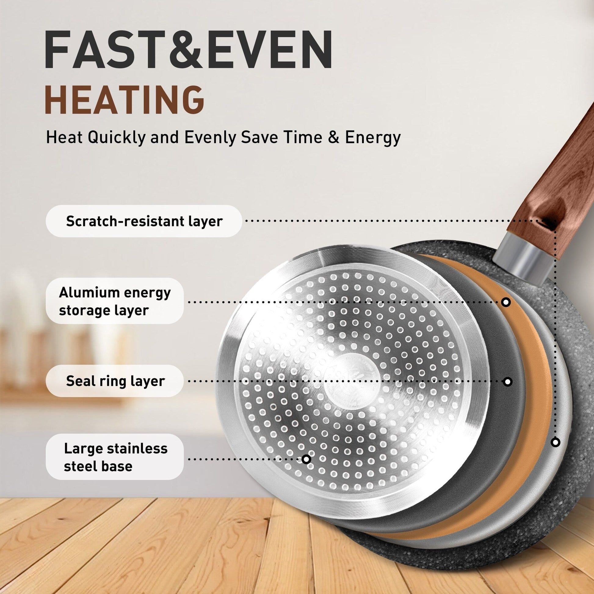 Set di pentole e padelle antiaderenti: quando si acquistano utensili da cucina, uno degli aspetti più importanti è l'antiaderenza. Il rivestimento in granito impedisce efficacemente al cibo di attaccarsi. Inoltre, potrete cucinare pasti più sani per la vostra famiglia, poiché non dovrete usare tanto olio. Potete cucinare la salsa di pomodoro in sicurezza con pentole in granito, il sapore e l'odore del cibo non cambieranno anche se utilizzate ingredienti acidi o dall'odore forte.