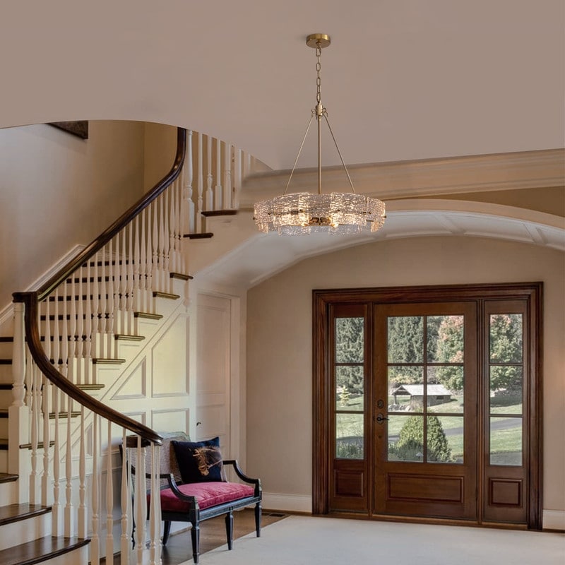 Questo lampadario moderno presenta un esclusivo guscio in vetro testurizzato, ispirato ai blocchi di ghiaccio naturali o alle increspature dell'acqua. Il lampadario è composto da più pezzi di vetro testurizzato, che circondano una sorgente luminosa centrale e formano un anello circolare. Questi pezzi di vetro emettono una luce calda e le loro superfici irregolari riflettono bagliori unici, creando un'atmosfera dinamica ma accogliente. Il lampadario è collegato al soffitto tramite aste metalliche e catene pendenti, consentendo di regolarne l'altezza in base alle proprie esigenze. Il corpo della lampada è sospeso al centro, utilizzando un design con aste di supporto cave e una struttura di collegamento a triplo gancio, con pezzi di vetro disposti in ordine sfalsato. Nel complesso, questo lampadario è sia decorativo che funzionale, adatto all'arredamento contemporaneo di case o spazi commerciali.