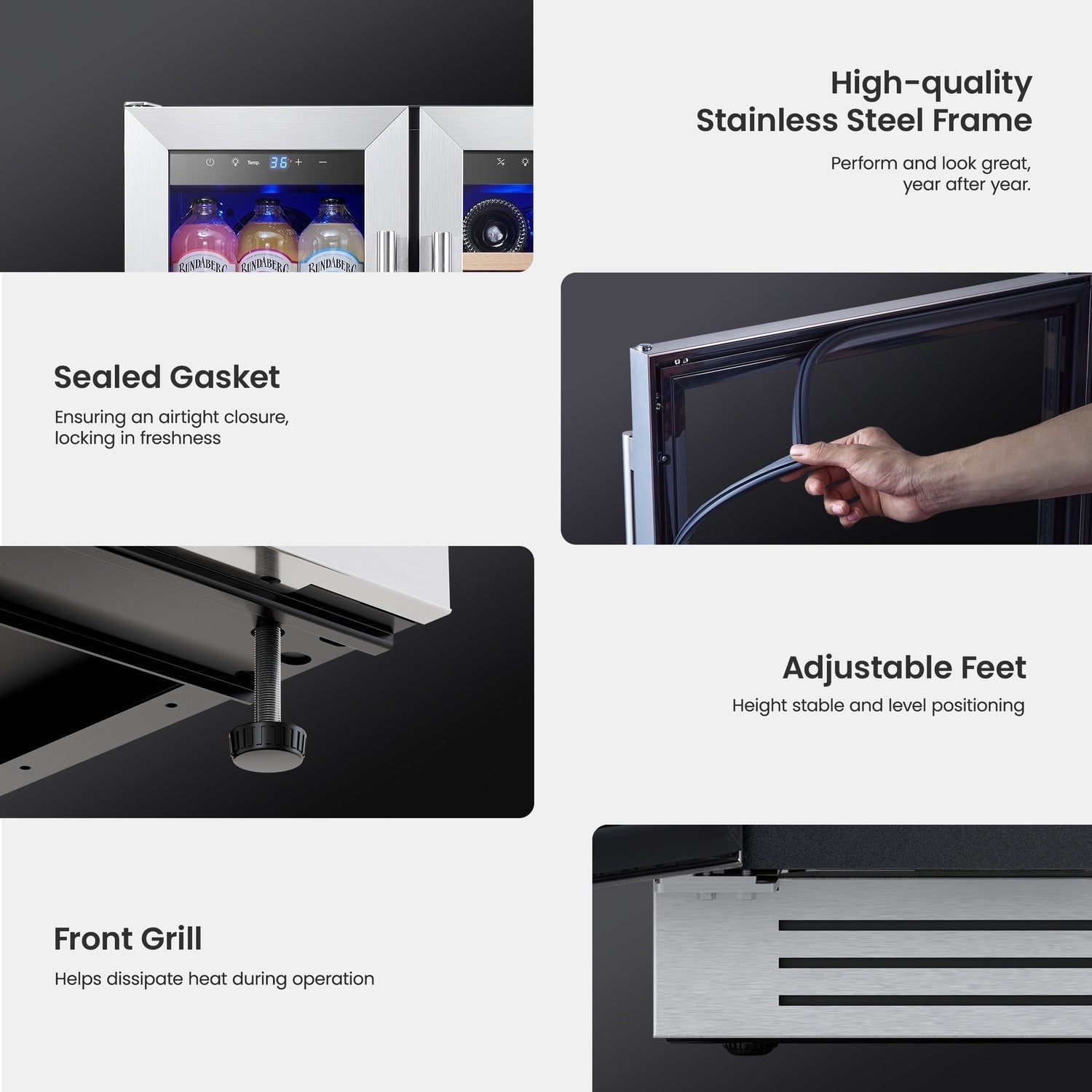 Design sicuro ed elegante: il vetro resistente ai raggi UV e la struttura in acciaio inossidabile garantiscono resistenza. Questo refrigeratore per vino e bevande si adatta a qualsiasi arredamento grazie al suo design elegante.