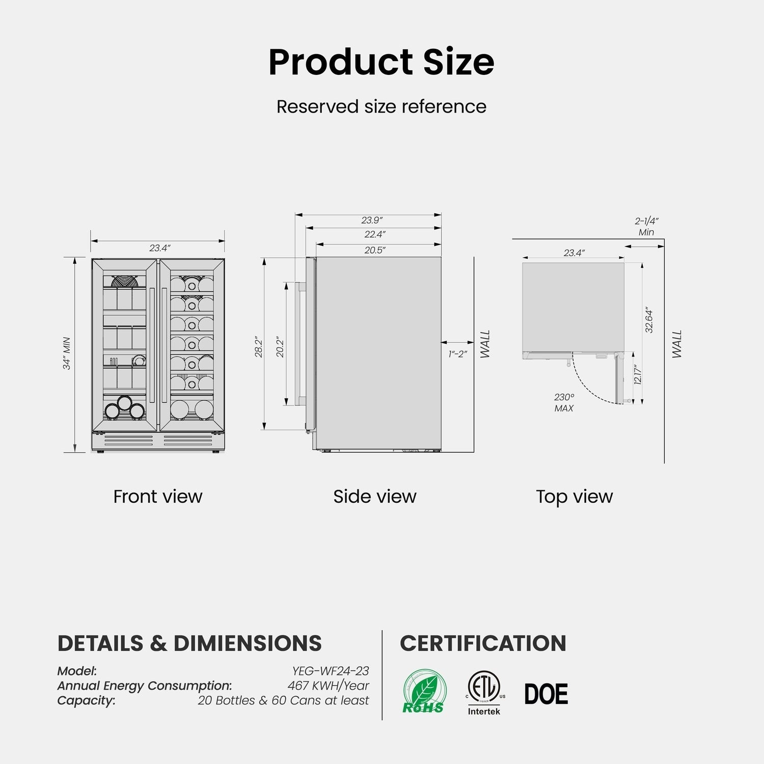 Ampia capacità: con una capacità di 20 bottiglie standard di Bordeaux da 750 ml e fino a 60 lattine da 350 ml, il frigorifero per vino e bevande Yeego soddisfa tutte le tue esigenze di intrattenimento. Il lato destro del frigorifero è dotato di sei ripiani in legno rimovibili per il vino, mentre il lato sinistro offre 3 ripiani in filo metallico regolabili per le bevande, offrendo una soluzione flessibile per bottiglie e lattine di varie dimensioni.