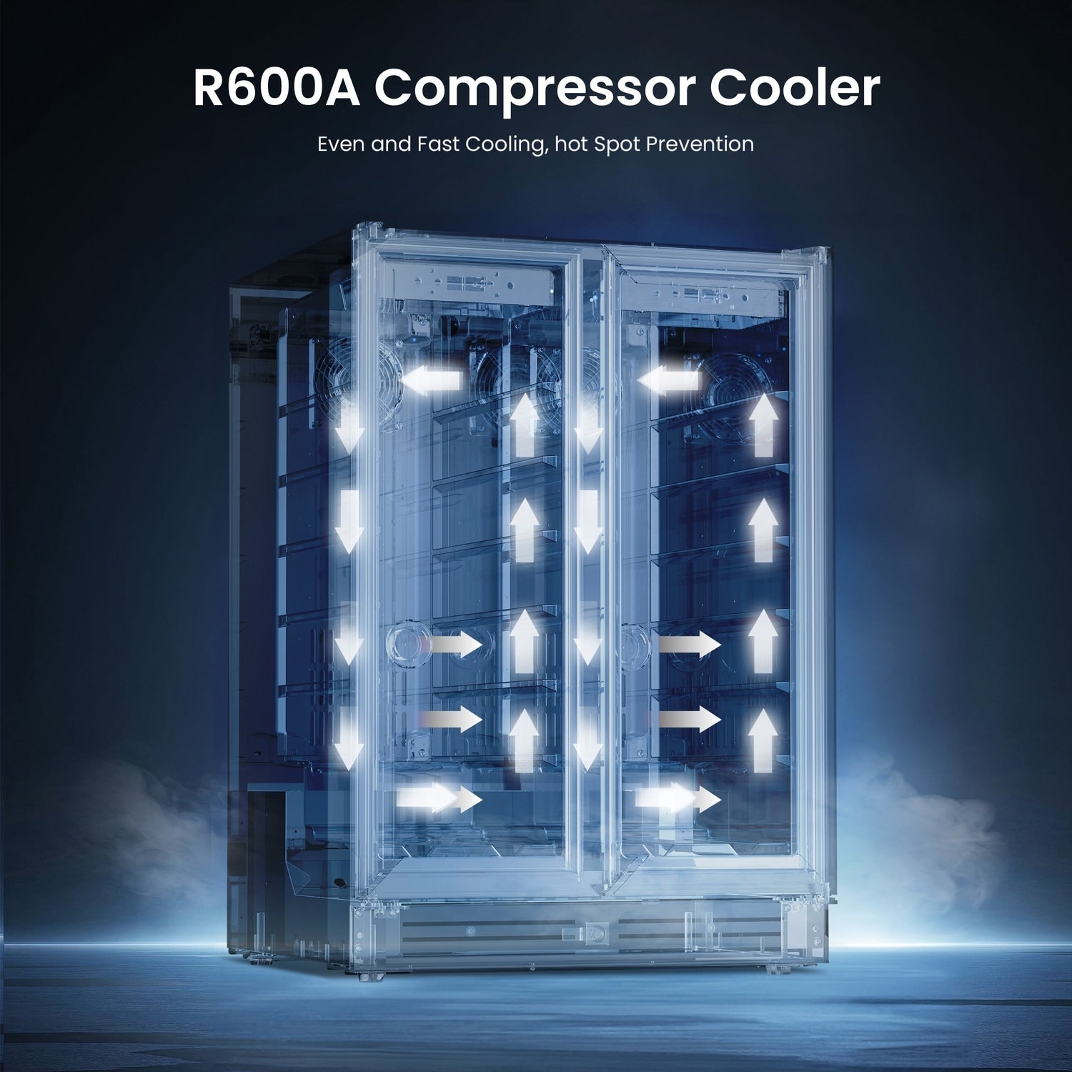 Raffreddamento ecologico ed efficiente: dotato di refrigerante R600a e certificazione DOE, il refrigeratore per vino e bevande Yeego offre un raffreddamento rapido e uniforme, risparmiando energia. Il sistema di ventilazione frontale migliora la circolazione dell'aria e la dissipazione del calore, mentre il filtro a carboni attivi rimuove gli odori, mantenendo un ambiente fresco all'interno di questo frigorifero per vino e bevande.