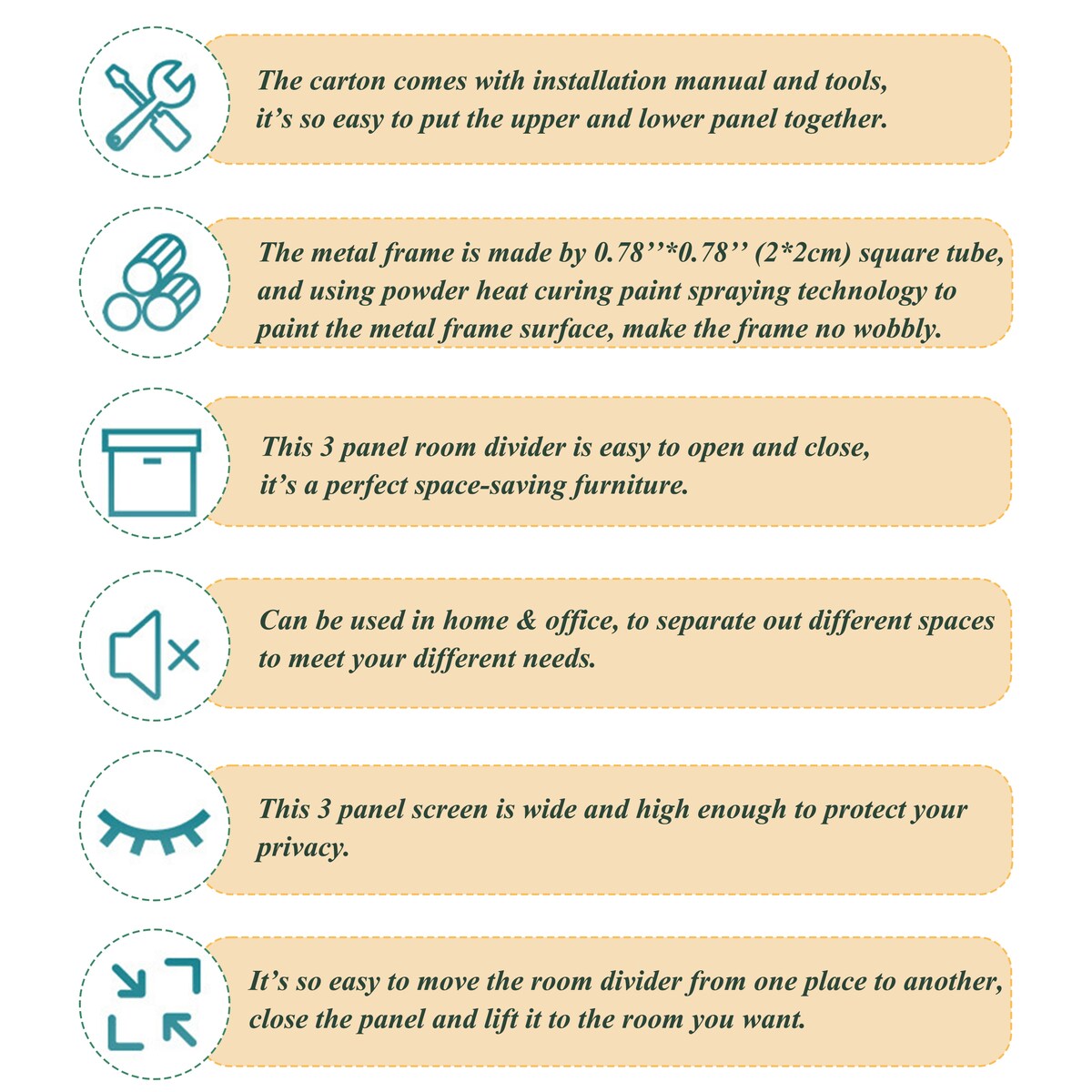 Trasforma il tuo spazio abitativo con il nostro splendido divisorio a 3 pannelli, un'aggiunta versatile ed elegante al tuo arredamento. Realizzato in metallo di alta qualità e legno di paulonia, questo divisorio autoportante vanta una splendida estetica rustica che si integra perfettamente con qualsiasi stile di casa. Perfetto per creare spazi separati per il lavoro, il gioco o il relax, il nostro divisorio è incredibilmente facile da spostare e può essere utilizzato in diverse stanze, tra cui soggiorno, camera da letto, sala da pranzo, studio e balcone.