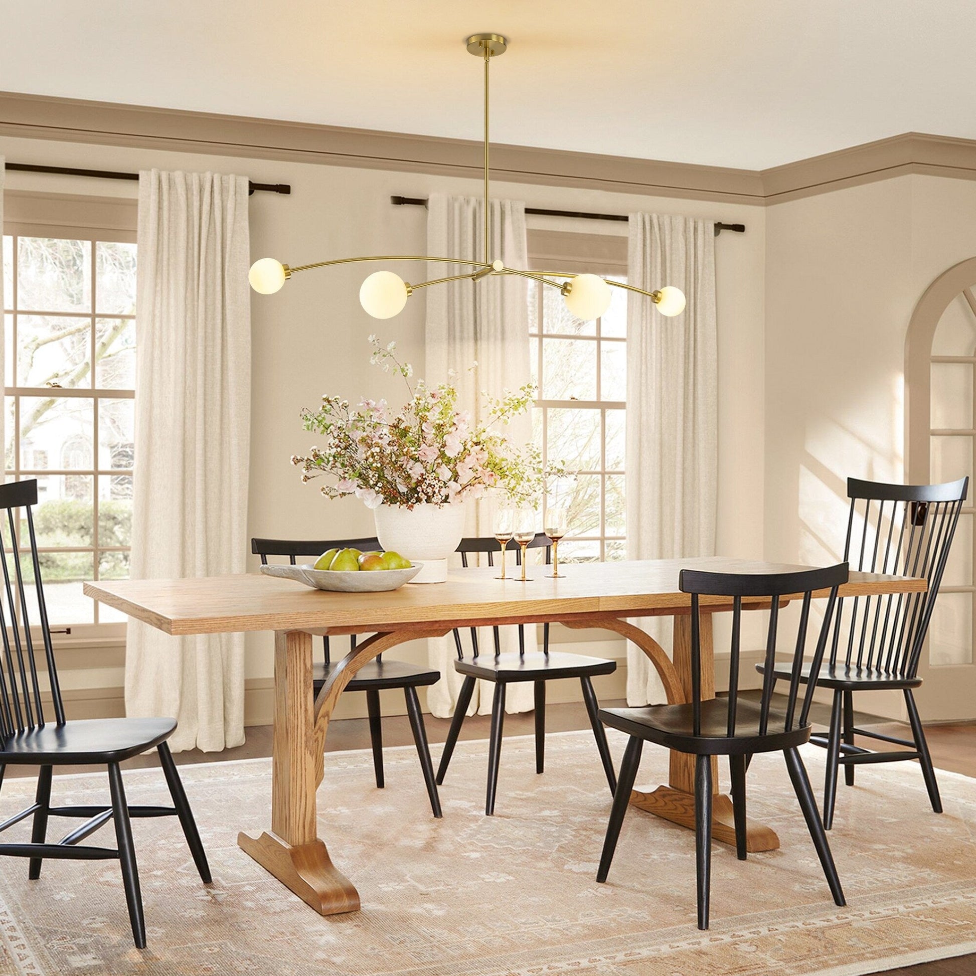 Ispirato al minimalismo moderno e al design Sputnik, questo lampadario lineare a sospensione a 4 luci combina eleganti archi dorati con morbidi globi in vetro satinato per un look contemporaneo ed elegante. Le aste metalliche delicatamente curve si estendono verso l'esterno in una formazione ben bilanciata, creando una silhouette elegante che esalta l'estetica di qualsiasi spazio. Perfetto per isole in cucina, zone pranzo o uffici domestici, questo apparecchio non solo fornisce un'ampia illuminazione, ma funge anche da elemento di design sorprendente per la tua casa. Caratteristiche:
