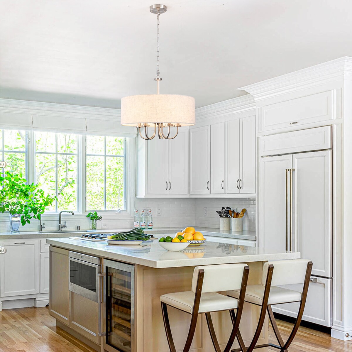 Caratterizzato da un paralume a forma di tamburo in lino, questo moderno lampadario mette in risalto elementi di design in stile costiero. Questa lampada a sospensione in stile rustico è realizzata in metallo e paralumi in lino, e il contrasto tra il colore e la texture del paralume e dei prodotti in metallo crea un effetto visivo divertente. Questo look è perfetto per fughe costiere, loft rilassati e cottage rustici. Dopo l'installazione, può ospitare cinque lampadine a candela fino a 60 W (lampadine non incluse), creando un'estetica a lume di candela per la tua casa.