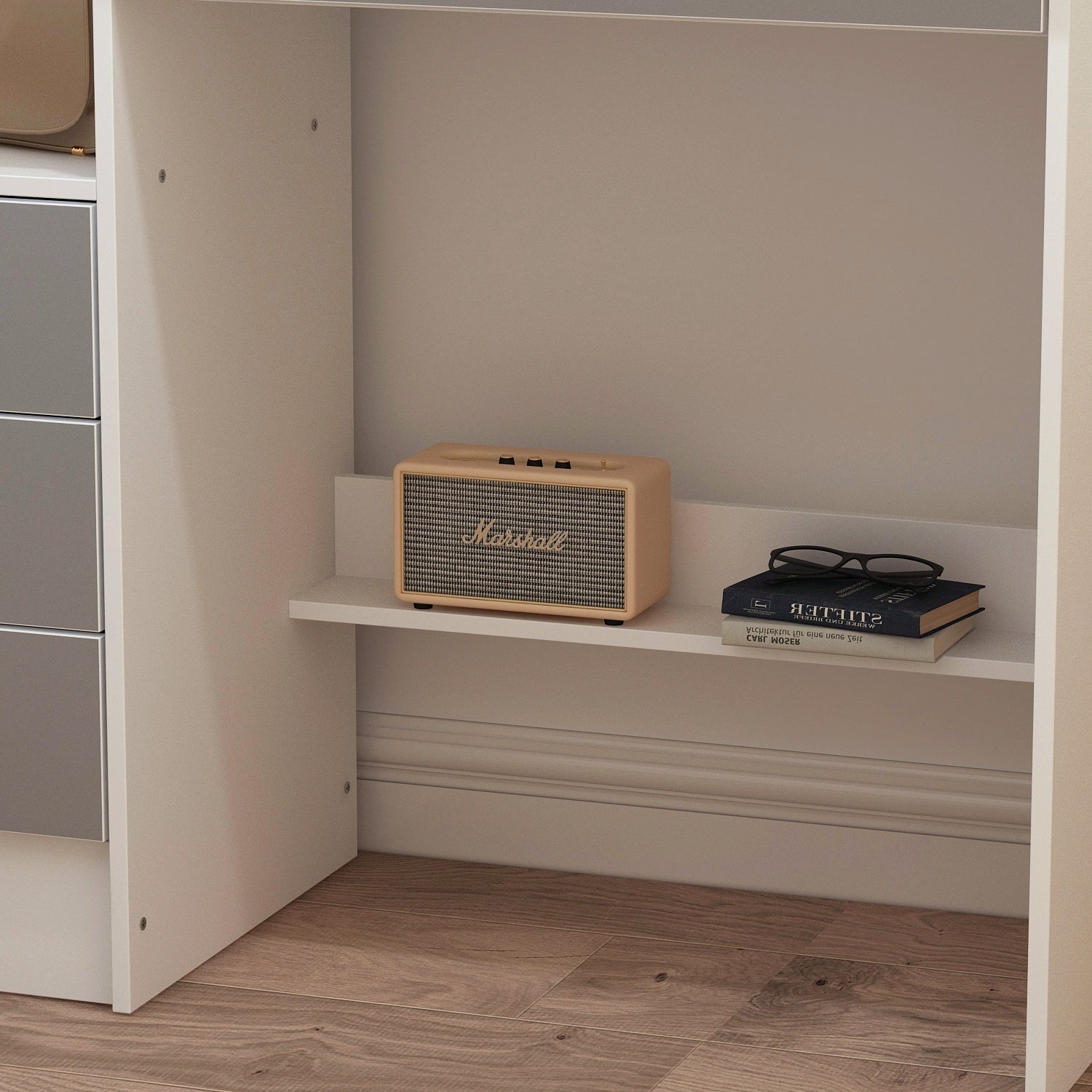 Questo set di toeletta e sgabello è dotato di scomparti per riporre i cosmetici. Il set di toeletta e sgabello è un elemento d'arredo moderno, elegante e pratico per la tua casa. L'ampio specchio per il trucco e i 4 cassetti offrono ampio spazio per cosmetici, profumi, lozioni, smalti, accessori per capelli, ecc. Lo sgabello imbottito è stabile e comodo da usare.