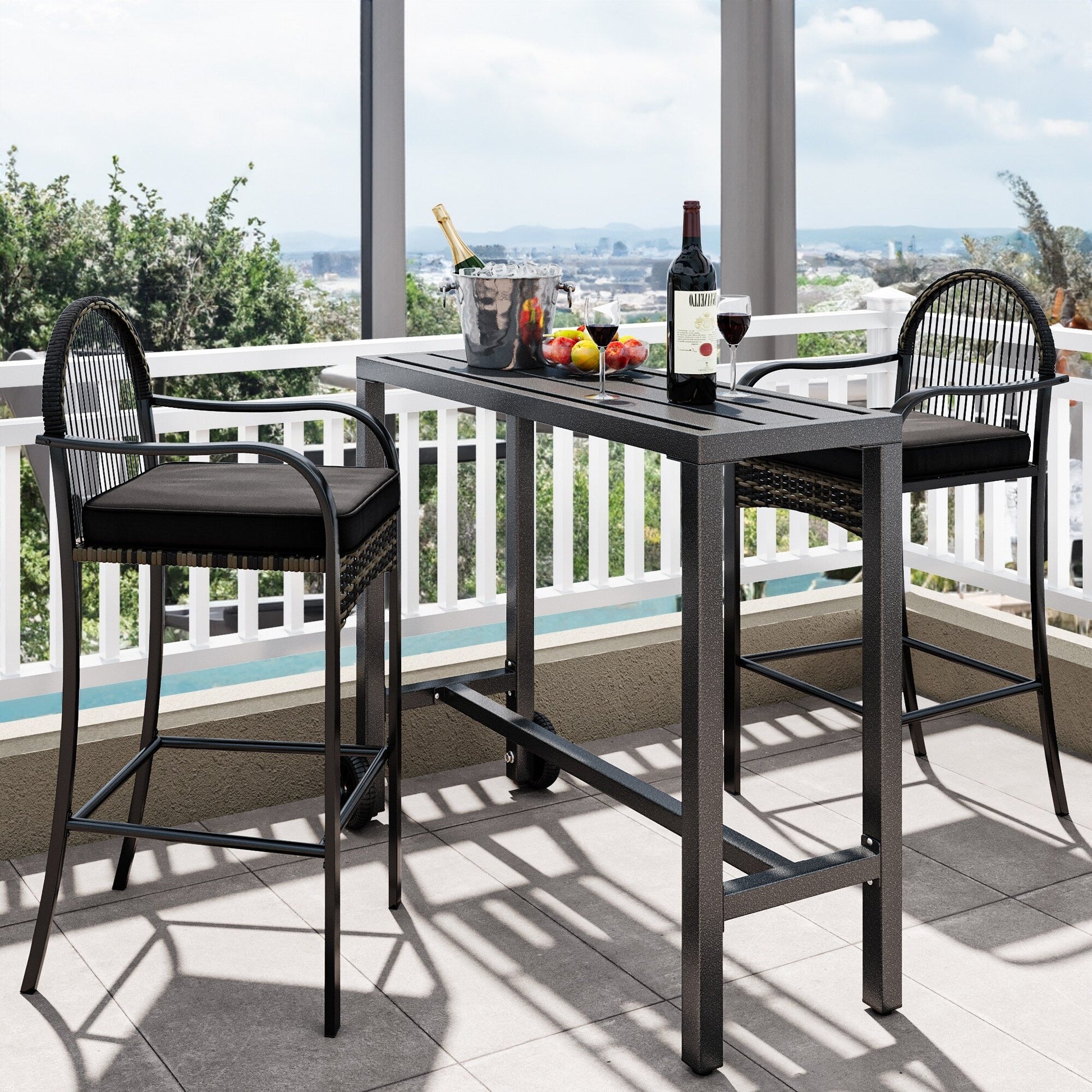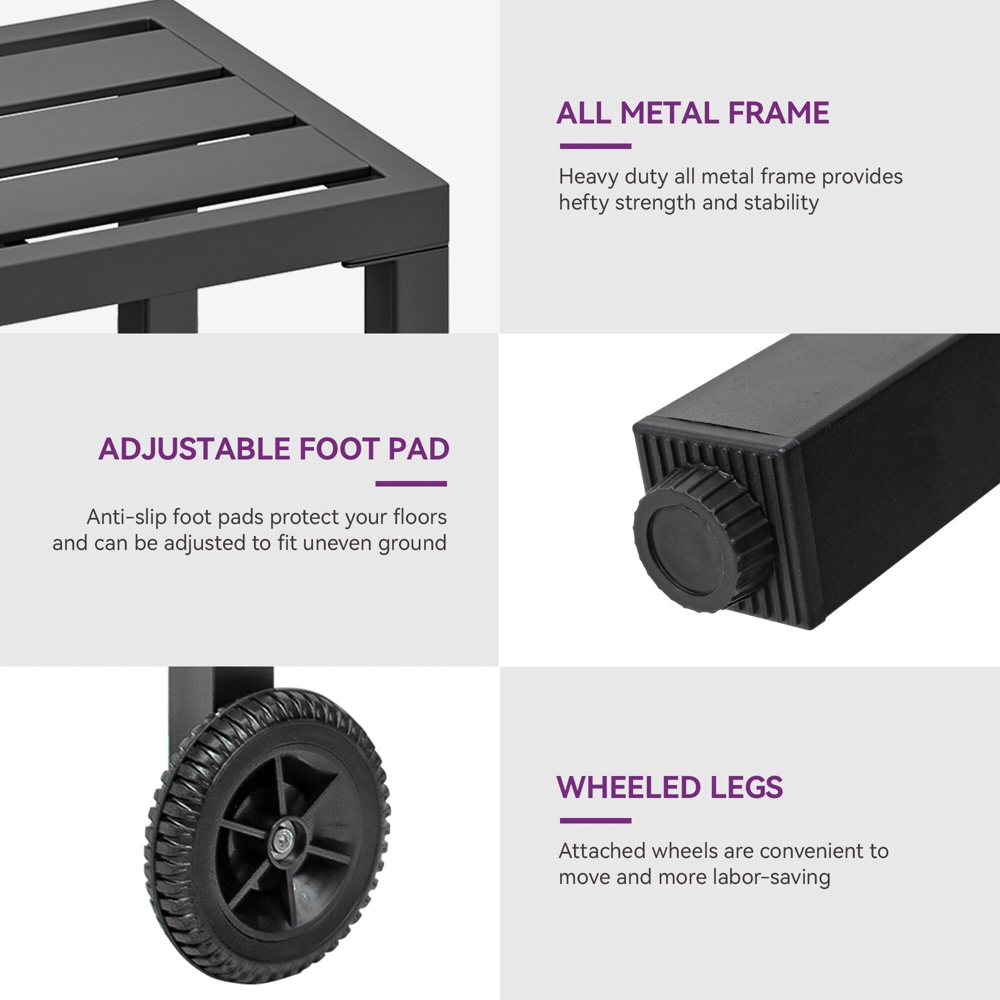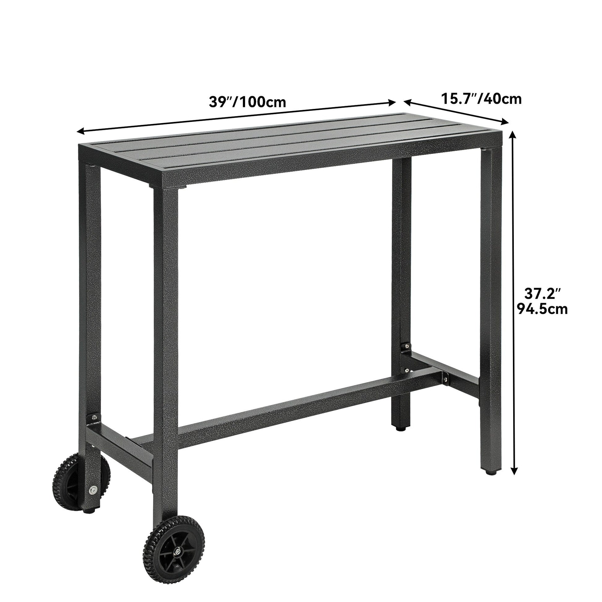 Il nostro tavolo da bar per esterni è un'aggiunta elegante e robusta al vostro spazio esterno. Realizzato in metallo di alta qualità con finitura verniciata a polvere, questo tavolo è resistente e robusto e vanta una capacità di carico di 120 kg, quindi può sopportare senza sforzo carichi pesanti. Inoltre, la comodità delle ruote su un lato ne facilita lo spostamento e lo spostamento.