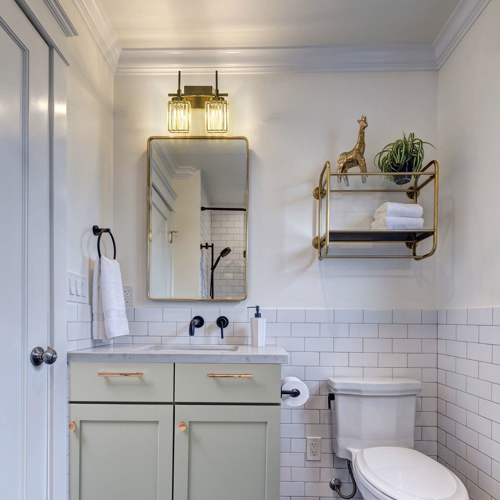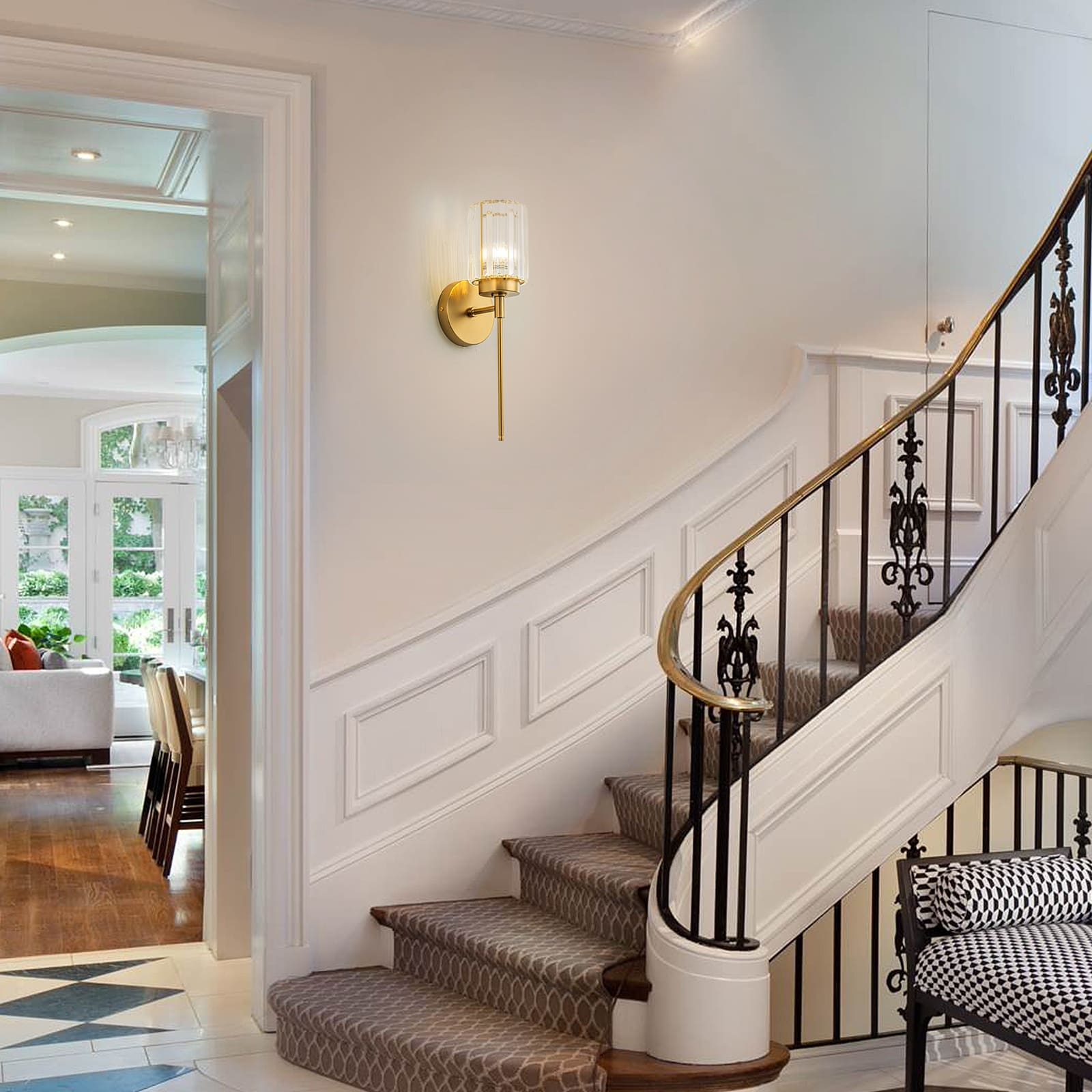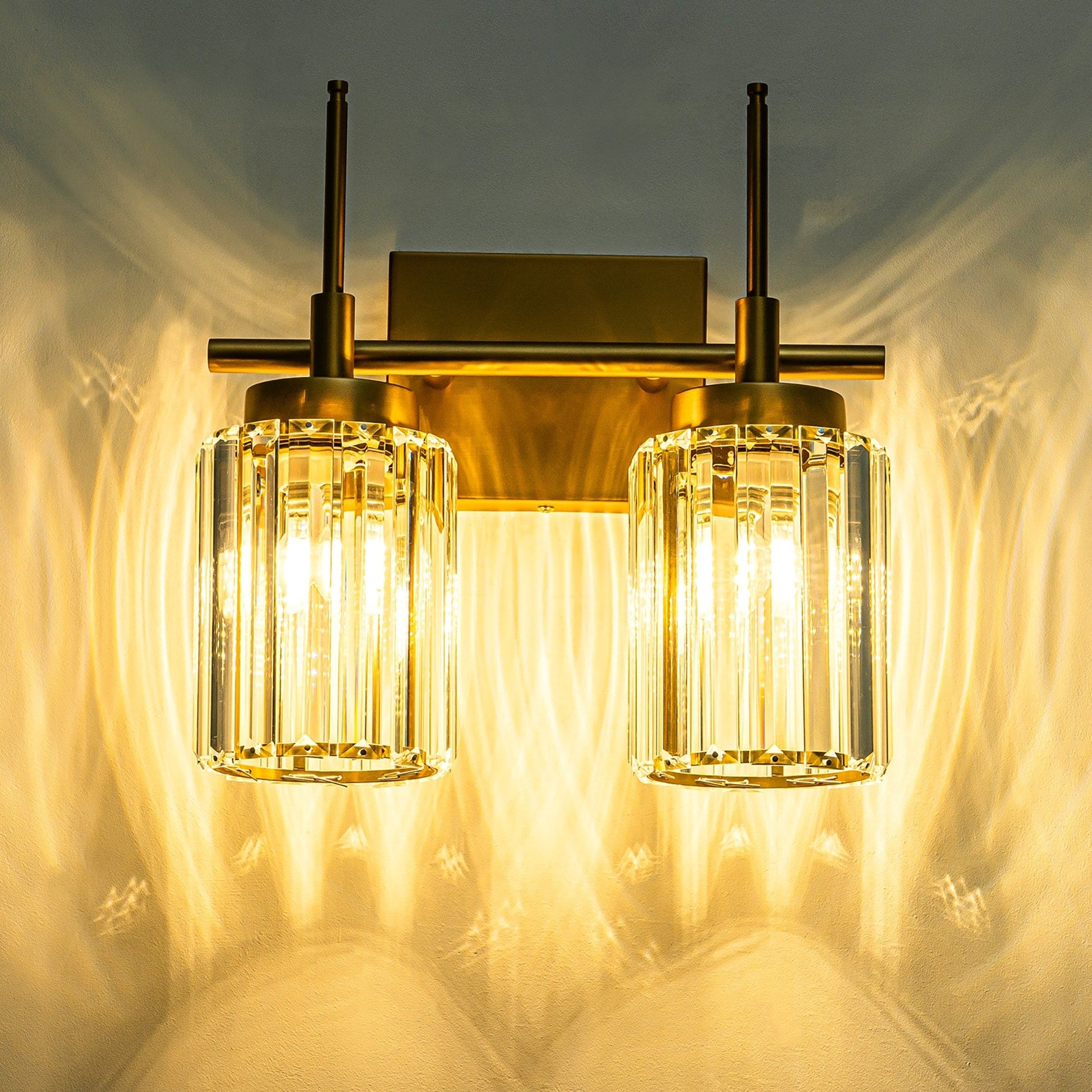 Esalta l'eleganza e la raffinatezza dell'arredamento del tuo bagno con la nostra lampada da toeletta in cristallo glamour. Questa lampada da toeletta in ottone spazzolato presenta una robusta struttura in metallo e un paralume in cristallo tagliato con precisione per garantirne la durata e un fascino senza tempo, promettendo di esaltare l'opulenza e la raffinatezza dell'estetica della tua stanza. I paralumi in cristallo di alta qualità sono appesi sotto un'asta lineare in metallo dorato che ne completa l'eleganza. Ogni paralume cilindrico in cristallo nasconde un affascinante spettro di tonalità arcobaleno, catturando lo sguardo anche alla luce naturale e fungendo da accattivante punto focale per lo specchio del tuo bagno o della tua zona spogliatoio.
