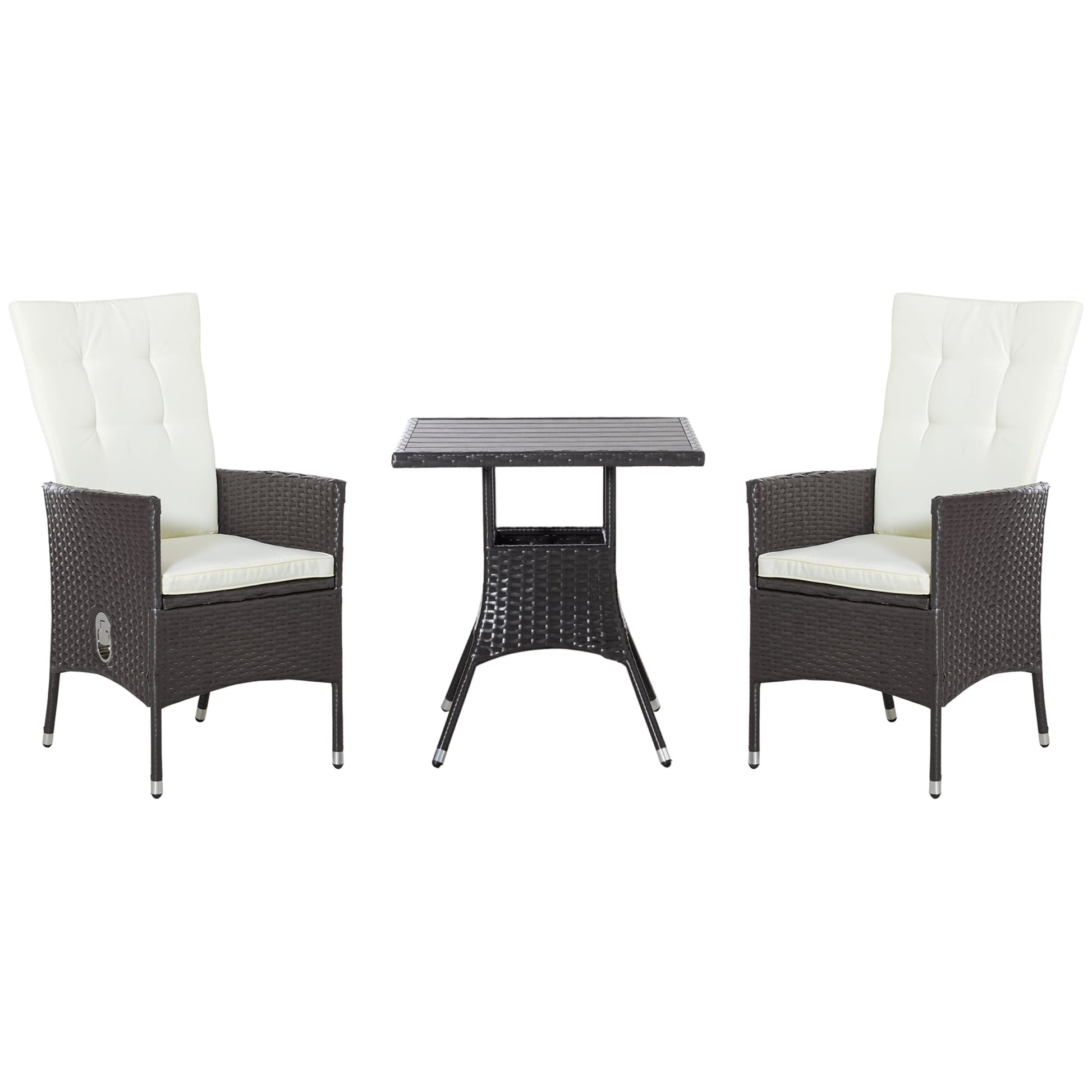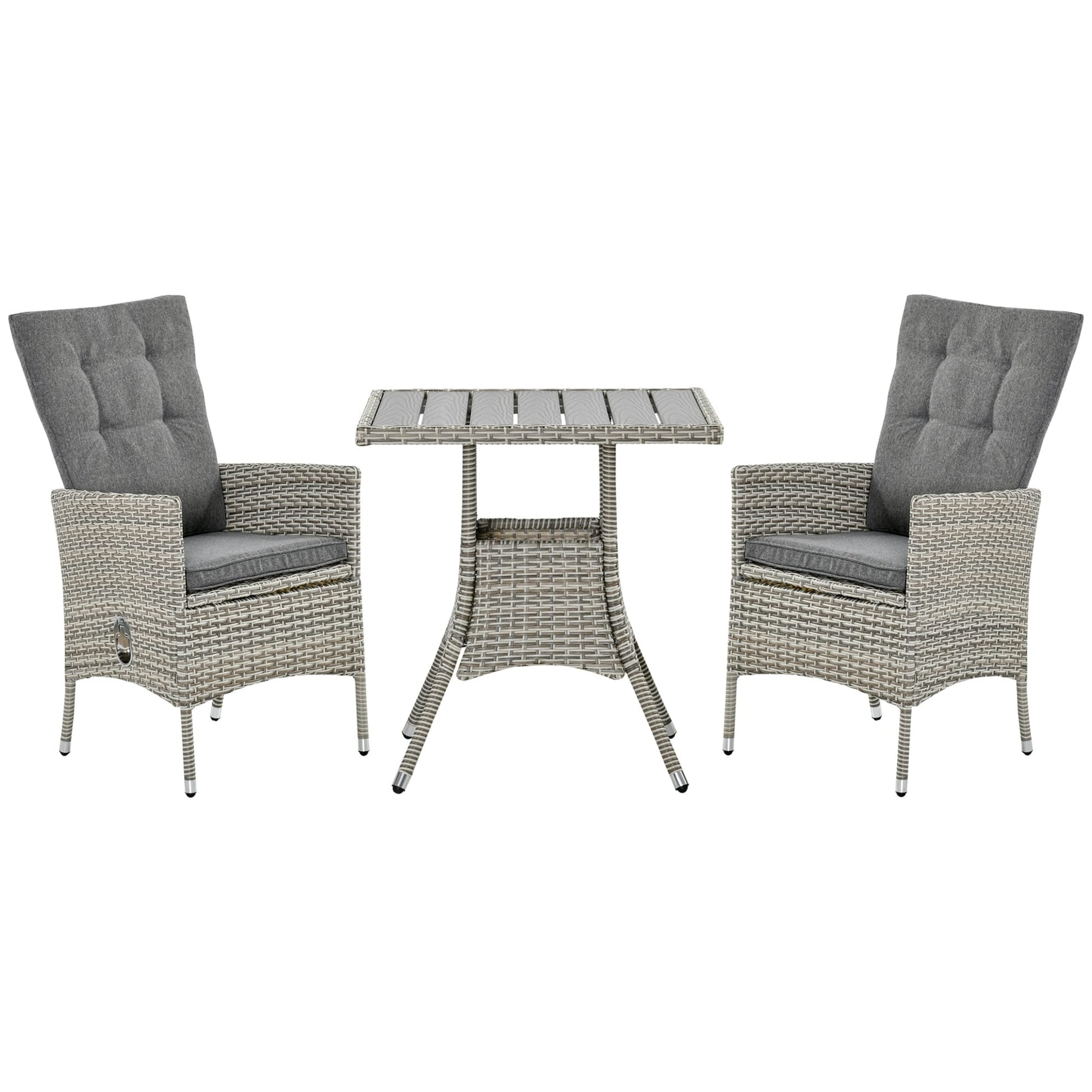Porta il comfort degli interni all'esterno con Outsunny. Il nostro set da tre pezzi per l'arredamento da giardino include due sedie reclinabili in vimini e un tavolino da caffè da esterno. Accomodatevi e rilassatevi su una seduta con cuscini spessi e uno schienale alto e reclinabile. Il tavolino da caffè ha un elegante design effetto legno con doghe per favorire il drenaggio dopo la pioggia. Il nostro rattan PE ha tutto lo stile intrecciato a mano del classico vimini, con una migliore resistenza all'acqua e alle intemperie. Uscite, mettetevi comodi, scegliete Outsunny.