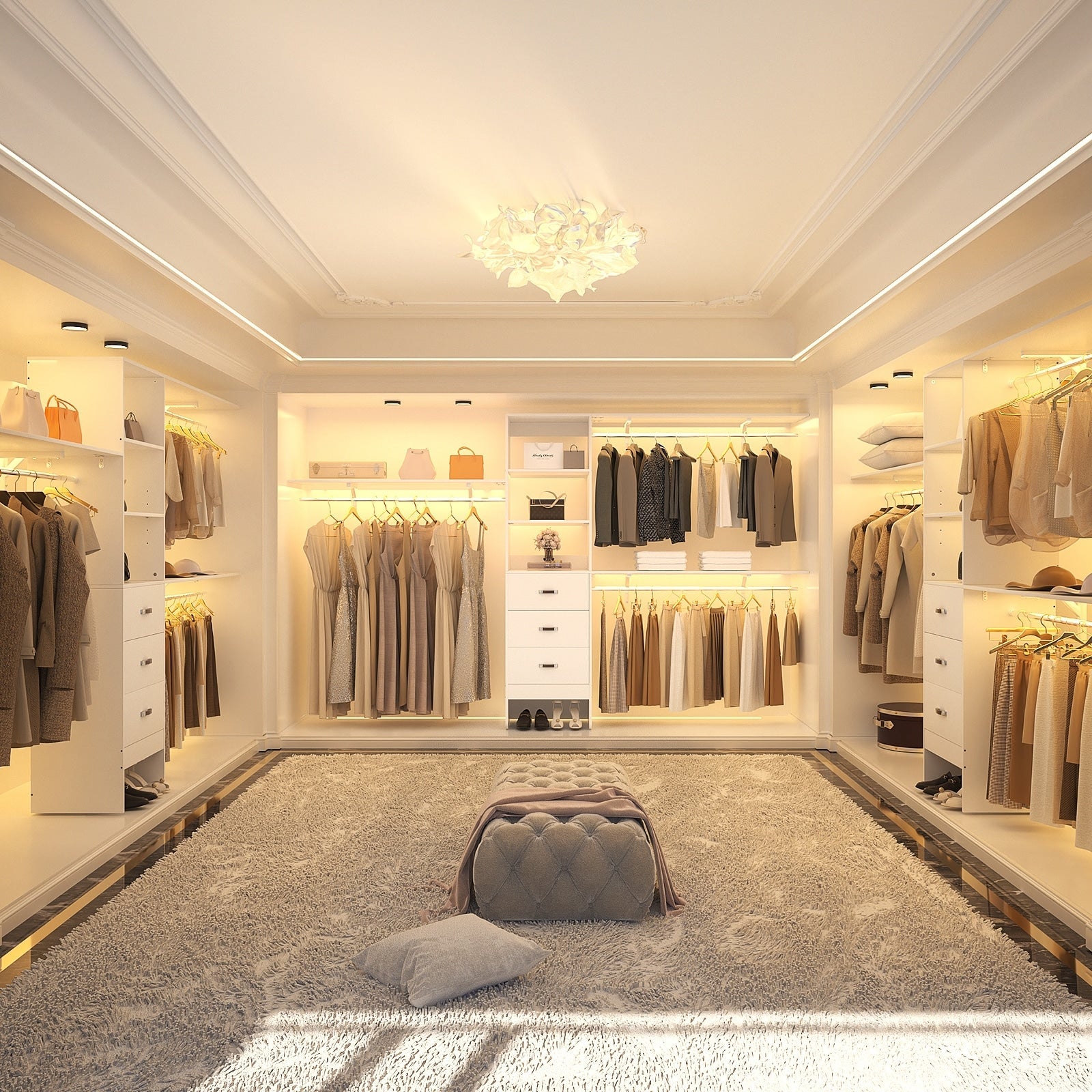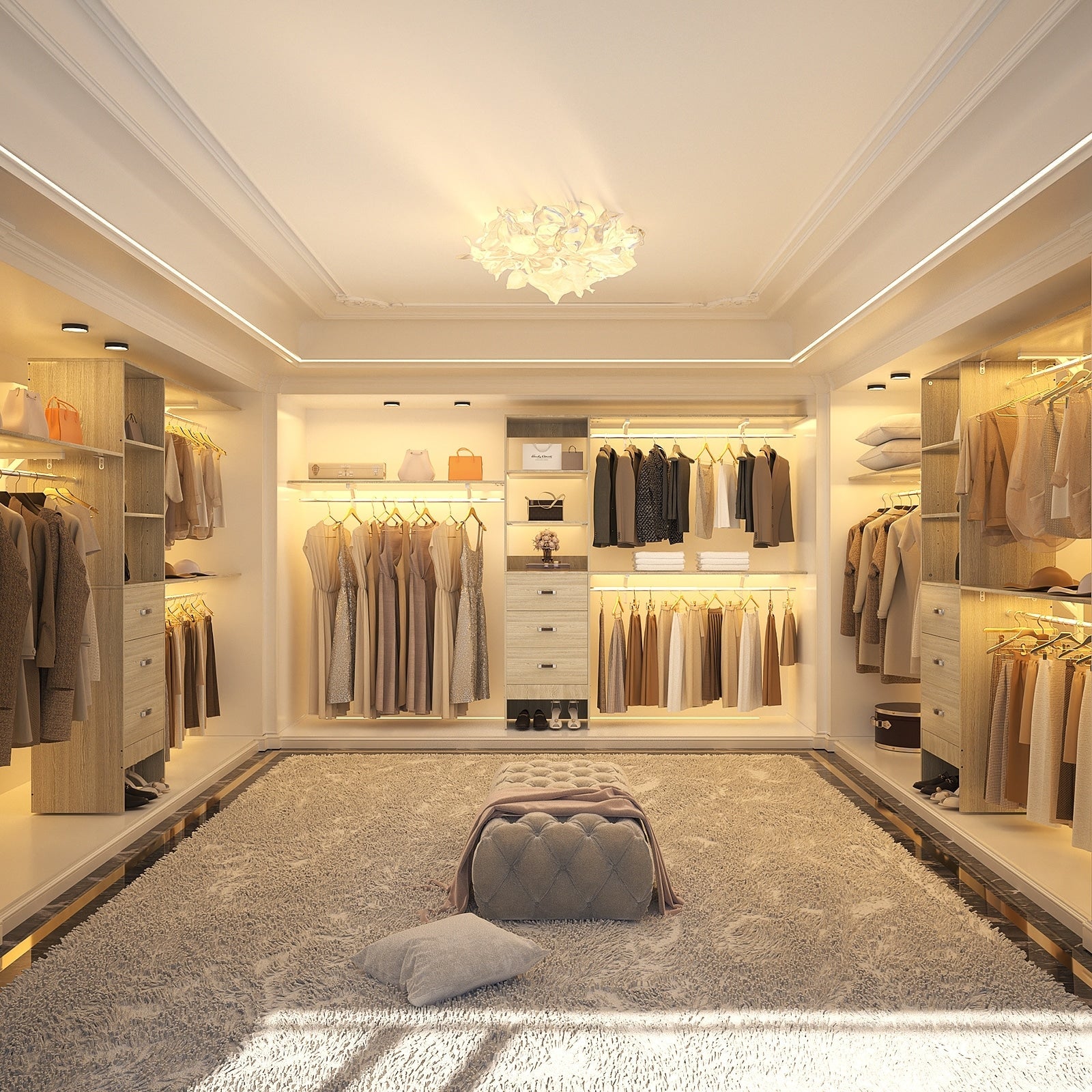 Trasforma il tuo armadio in una soluzione funzionale e accattivante con il nostro sistema di organizzazione per armadi di alta qualità. Realizzato in legno laminato di grado E1, questo sistema di organizzazione per armadi unisce resistenza e stile, rendendolo un'aggiunta pratica ed elegante a qualsiasi guardaroba. Disponibile in due dimensioni, 96 pollici e 120 pollici di larghezza, questo sistema personalizzabile si adatta al tuo spazio e alle tue esigenze. L'ampio piano in legno offre un'ampia superficie per ulteriore spazio di archiviazione. Dotata di ripiani tagliabili e aste appendiabiti regolabili, questa soluzione di organizzazione offre uno spazio di archiviazione personalizzabile in base alle tue esigenze.