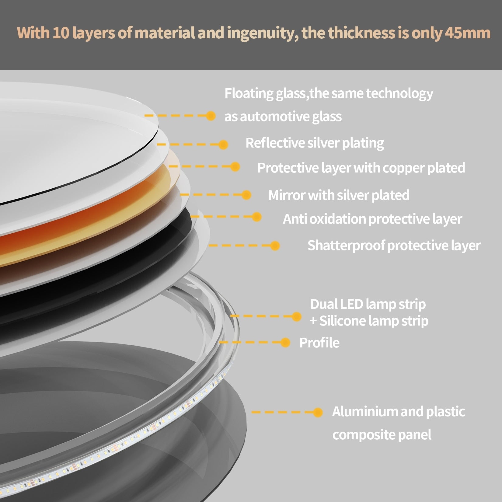 Uno specchio elegante illumina la vita. Specchio da bagno senza cornice decorato con un creativo bordo satinato, che unisce un tocco di raffinatezza e lusso, creando un look perfetto per qualsiasi bagno. La striscia LED emette una luminescenza più uniforme. Premere brevemente il pulsante per cambiare la temperatura del colore: l'illuminazione bianca offre un'illuminazione sufficiente, mentre la luce calda crea un'atmosfera accogliente di notte. Ampia superficie antiappannamento integrata, la funzione antiappannamento si attiva entro 3-4 minuti durante la doccia, mantenendo lo specchio libero dal vapore. Tre pulsanti sullo schermo per controllare in modo indipendente accensione/spegnimento e luminosità, colori di illuminazione e antiappannamento. Dotato di una presa elettrica standard, può essere collegato e spostato in qualsiasi stanza con una presa, senza bisogno di cavi, ideale per case, uffici e progetti alberghieri.