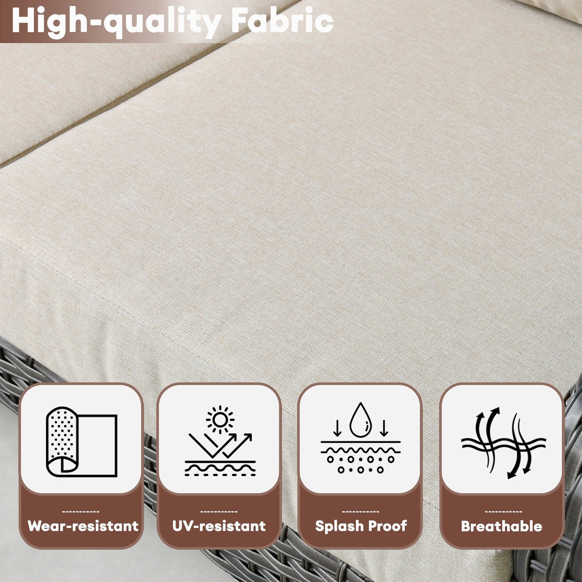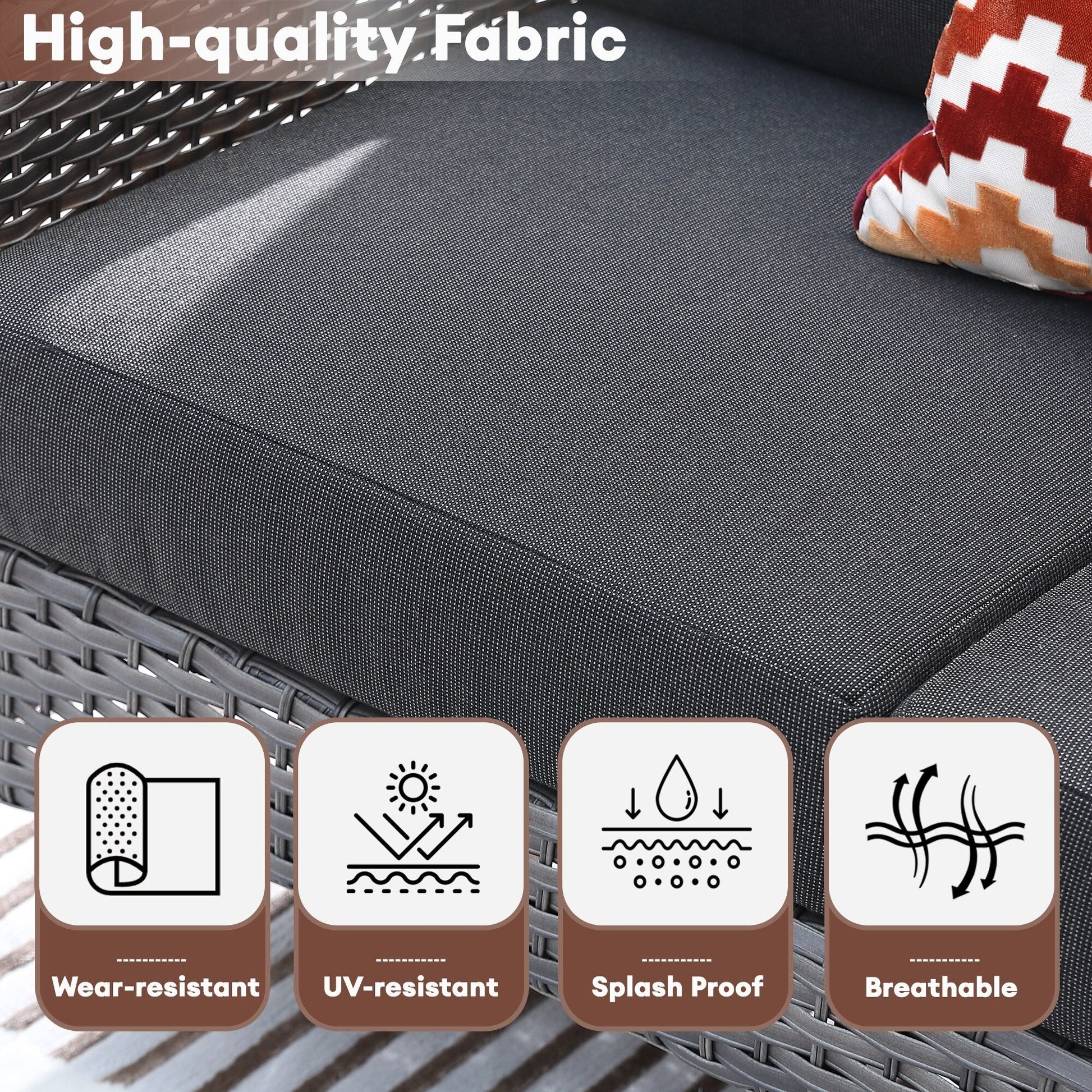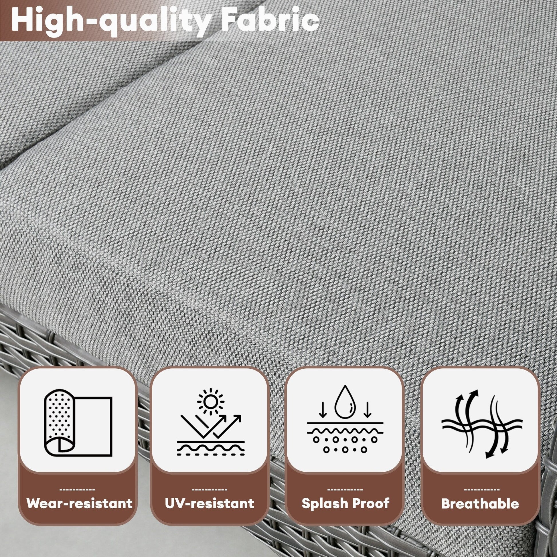 La robusta struttura in metallo verniciato a polvere e il vimini in rattan PE resistente alle intemperie rendono questo set elegante e durevole. Le fodere dei cuscini resistenti ai raggi UV e all'usura sono adatte per un uso prolungato all'aperto. Dotato di cuscini imbottiti spessi e ad alta resilienza, offre il massimo comfort e relax. Il tavolo con design a due livelli offre ulteriore spazio di archiviazione, perfetto per ospitare gli amici o trascorrere momenti divertenti con la famiglia.