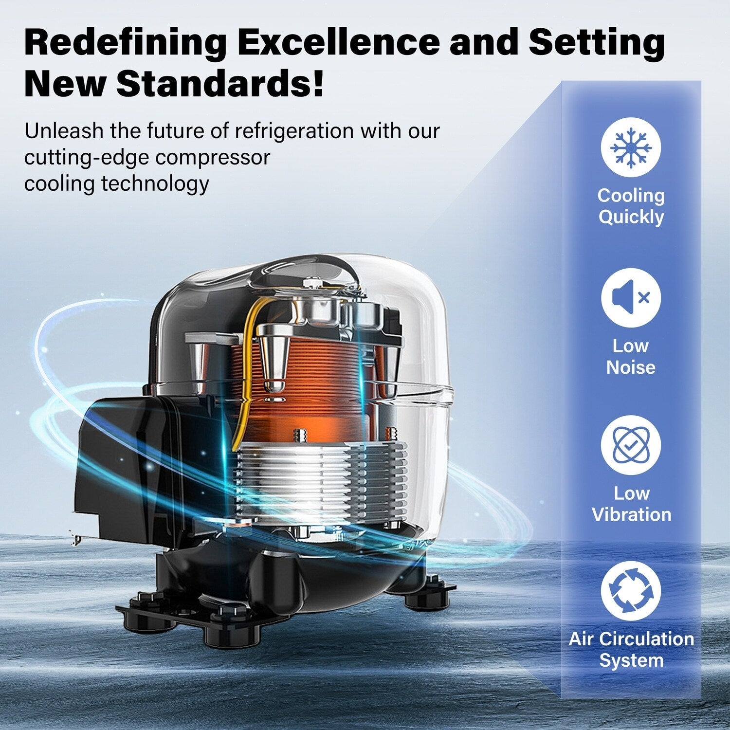 Raffreddamento rapido ed ecologico : grazie al refrigerante R600a avanzato, questo frigorifero per bevande raffredda rapidamente e in modo uniforme in soli 40 minuti. Il sistema di raffreddamento ecologico è certificato DOE per l'efficienza energetica, riducendo il consumo energetico e l'impatto ambientale, offrendo al contempo potenti prestazioni di raffreddamento.